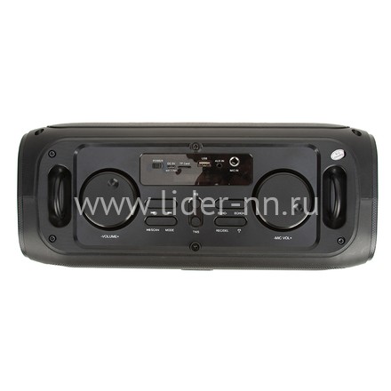 Также на панели управления находятся две большие ручки для управления громкостью самой колонки и громкостью микрофона, есть кнопки эквализации и эха на микрофон, традиционные кнопки переключения треков, кнопка записи звука и его удаления, кнопка переключения режимов воспроизведения.