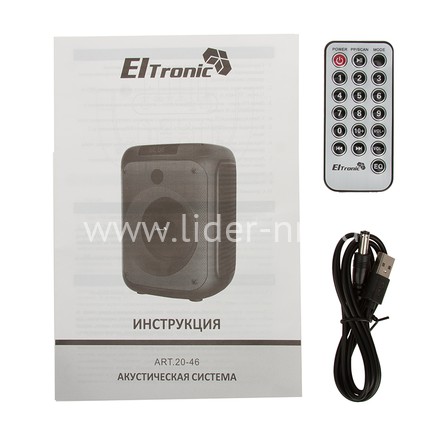 В комплект ELTRONIC 20-46 CRAZY BOX 150, помимо самой переносной колонки, входит пульт дистанционного управления (это решение оценят аниматоры, которым можно перемещаться по всему залу, а не стоять рядом с колонкой), кабель питания и инструкция на русском языке.