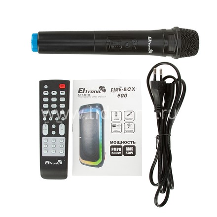 Есть купить колонку для вечеринок, то в коробке, помимо самой акустической системы, вы обнаружите кабель для питания колонки, беспроводной микрофон, пульт дистанционного управления и инструкцию на русском языке.