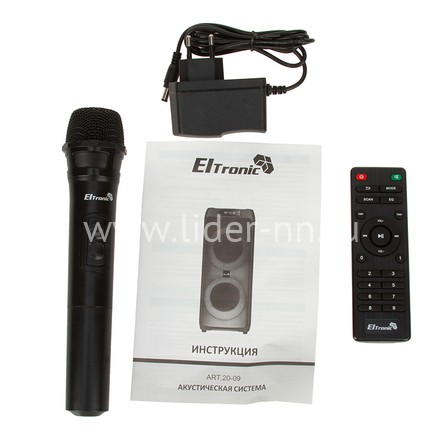 В комплектацию ELTRONIC 20-09 FIRE BOX 800, помимо самой колонки с блютузом, входят пульт дистанционного управления, кабель питания 220V, инструкция на русском языке и радиомикрофон для караоке или проведения конференций.