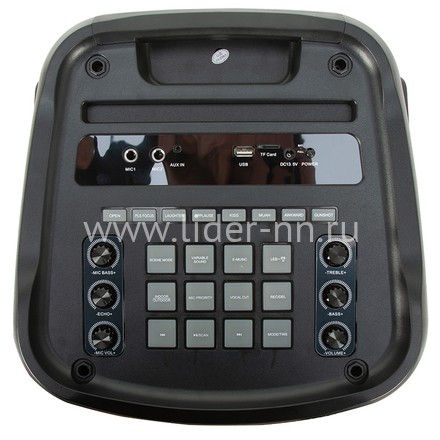 Панель управления у колонки с блютузом и флешкой находится сверху. Сразу обращает на себя внимание обилие кнопок для управления звуком. Только у микрофона можно регулировать громкость, объемное звучание, эхо и басы. У самой колонки аналогично есть настройка громкости, управление высокими частотами и басами. Отдельно можно выделить множество настроек со спецэффектами.