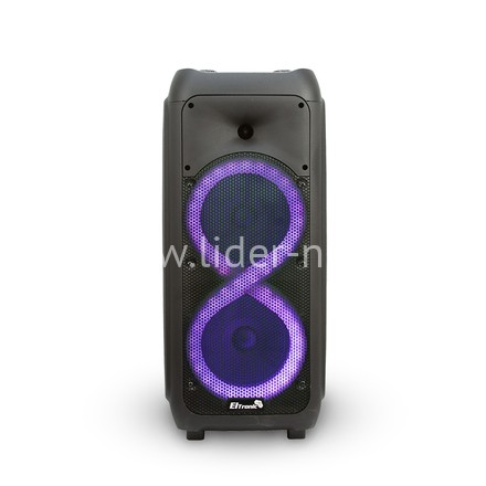 Беспроводная блютуз колонка с двумя динамиками по 8 дюймов, магниты внутри большие, что обеспечивает хороший, качественный звук. Частотный диапазон у акустики довольно широкий, у звука есть дыхание.