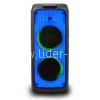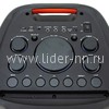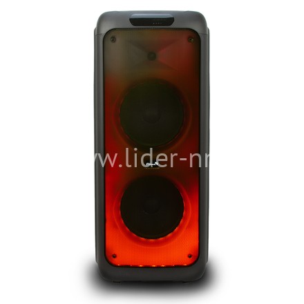 Еще в комплекте, помимо колонки и микрофона, есть пульт дистанционного управления, инструкция на русском языке и кабель питания 220V. Кроме стандартного подключения к сети, в акустической системе есть встроенный аккумулятор, позволяющий прослушивать музыку до 5 часов. Подразумевается, что колонка, несмотря на внушительные размеры, будет мобильна. Она легко перемещается на значительные расстояния также, как обычный чемодан, на колесиках и за ручку.