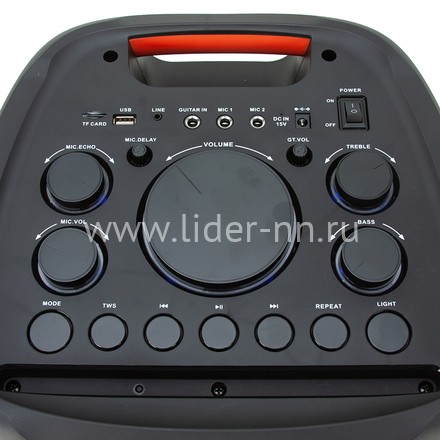 В целом у панели управления акустической системой широкий функционал. Существует отдельное управление параметрами микрофонов, можно добавить эхо и громкость. В центре панели большая клавиша, регулирующая у колонки общий уровень силы звука. Индивидуально настраивается громкость гитары. Кнопка MODE отвечает за выбор режима соединения, всего их 4: блютуз, AUX-кабель, флешка или SD и MicroSD-карты, возможно поймать FM-радио. Все манипуляции с колонкой отражаются на дисплее.