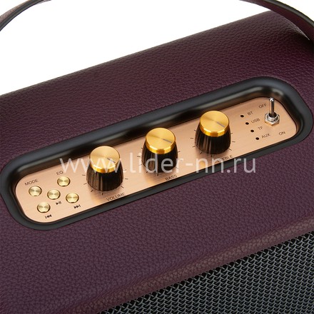 От ретро-дизайна у блютуз колонки для дома есть еще плотная оплетка, закрывающая динамики, золотая пластина с панелью управления и ручками под старину, а также ремень для переноски, выполненный из того же материала, что и корпус колонки. Еще в комплектацию блютуз колонки для дома входит блок питания и инструкция на русском языке.
